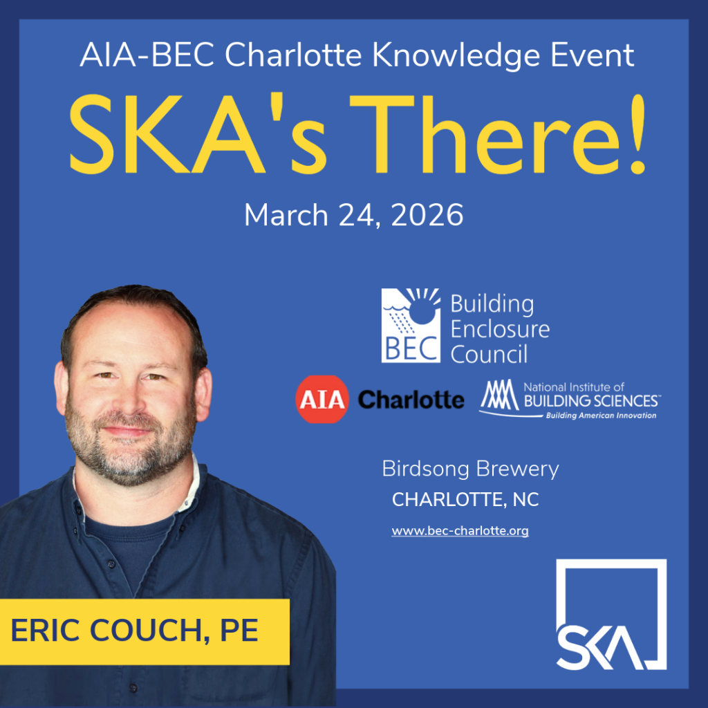 Eric Couch, PE, Knowledge Co-Chair at BEC Charlotte, is looking forward to the live demonstration & presentation on Window Performance Testing on March 24th at 4-6pm with WJE’s Kevin Berry & Ryan Wilborne. Eric is a Senior Project Engineer in our Building Solutions service line. He loves the problem-solving aspect of building enclosure failure investigations, peer reviews on new or existing facades, and developing details for difficult transitions. Come, make and take part in discussions, knowledge and insights sharing, and support for this industry.