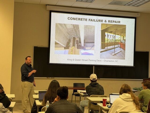 Eric Couch, PE and fellow alum Garrett Overcash of SE spoke at Courtney Green’s Reinforced Concrete class at the University of North Carolina Charlotte. They were invited to Assistant Professor Courtney Green’s Reinforced Concrete class to bring real world project experience on smart concrete design, and the importance of maintenance and condition assessments. This was greatly appreciated by the students as aspiring future engineers.